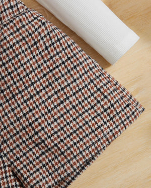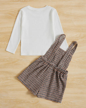 Stylish 2-piece outfit for girls featuring a soft mock neck tee paired with a classic plaid overall dress. Comfortable and versatile, perfect for school, outings, or casual autumn and winter wear.