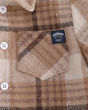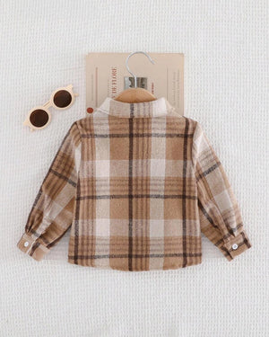 Classic khaki plaid flannel shirt for baby boys. Soft cotton blend, button-up front, and cozy fit – ideal for autumn and winter layering.