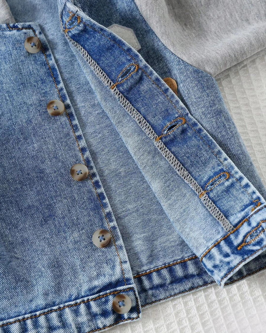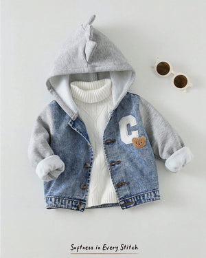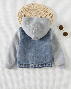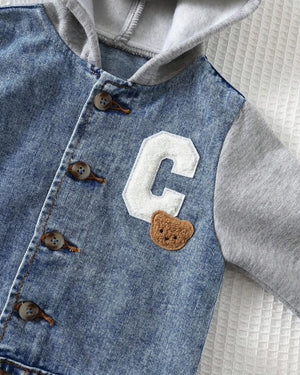 Cute baby boy denim jacket with cozy grey hoodie and bear patch. Perfect for chilly days with warm inner lining and button front closure.