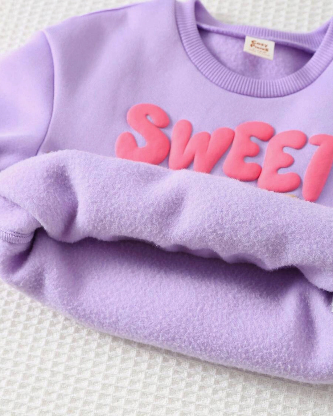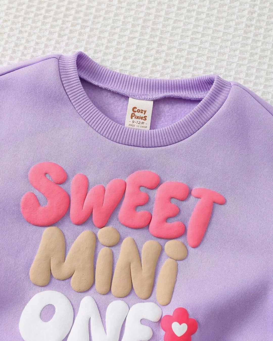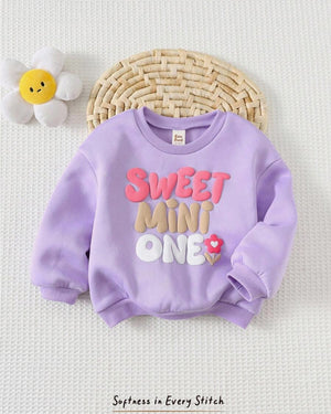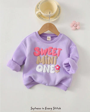 Adorable lilac baby girl sweatshirt with soft fleece lining and 3D “Sweet Mini One” print. Cozy, stylish, and perfect for everyday wear.