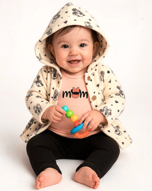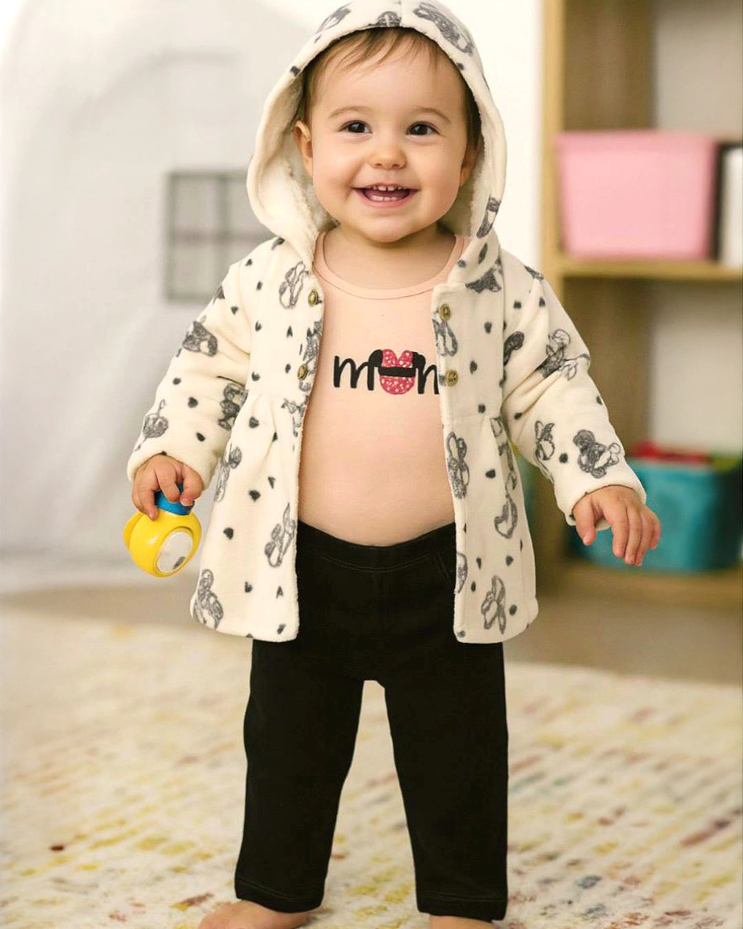 Cozy 3-piece set for baby girls. Includes a warm printed fleece hoodie, a cute bodysuit with “Mom” print, and stretchy black pants.