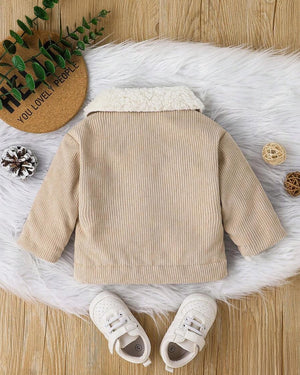 Cozy thermal-lined corduroy jacket for baby girls and boys. Features flap pocket details and soft inner lining for added warmth. A stylish and practical outerwear piece for chilly days.