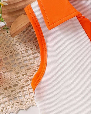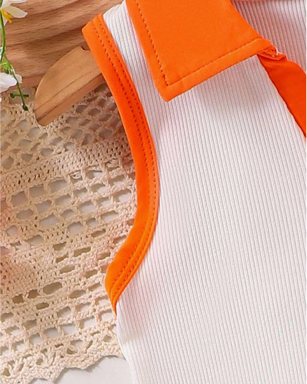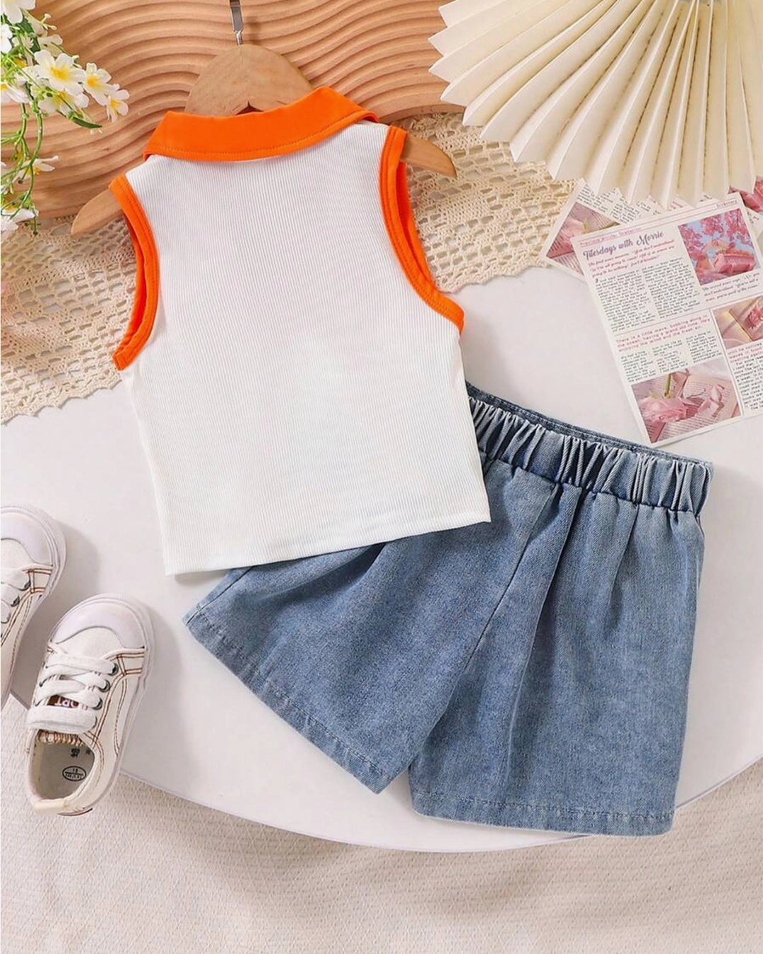 2pcs Young Girl 3D Floral Knit Colorblock Polo Top And Denim Ruffle Skort Set, Summer