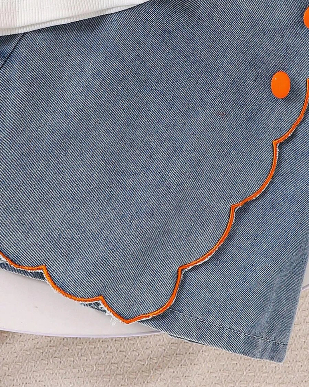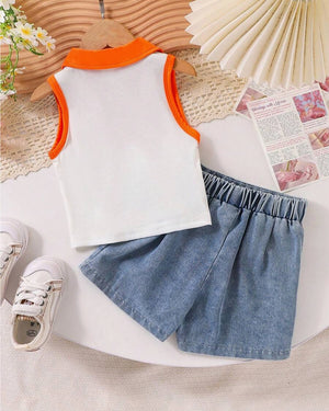 Girls' 3D Floral Polo Top & Denim Ruffle Skort Set