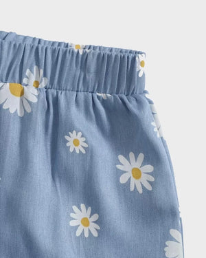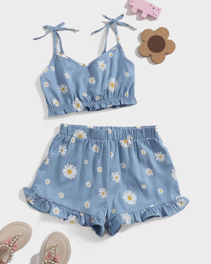 Charming two-piece set for girls, featuring a daisy-printed tie-strap top with ruffle detail and matching shorts. Ideal for summer outings and casual days.