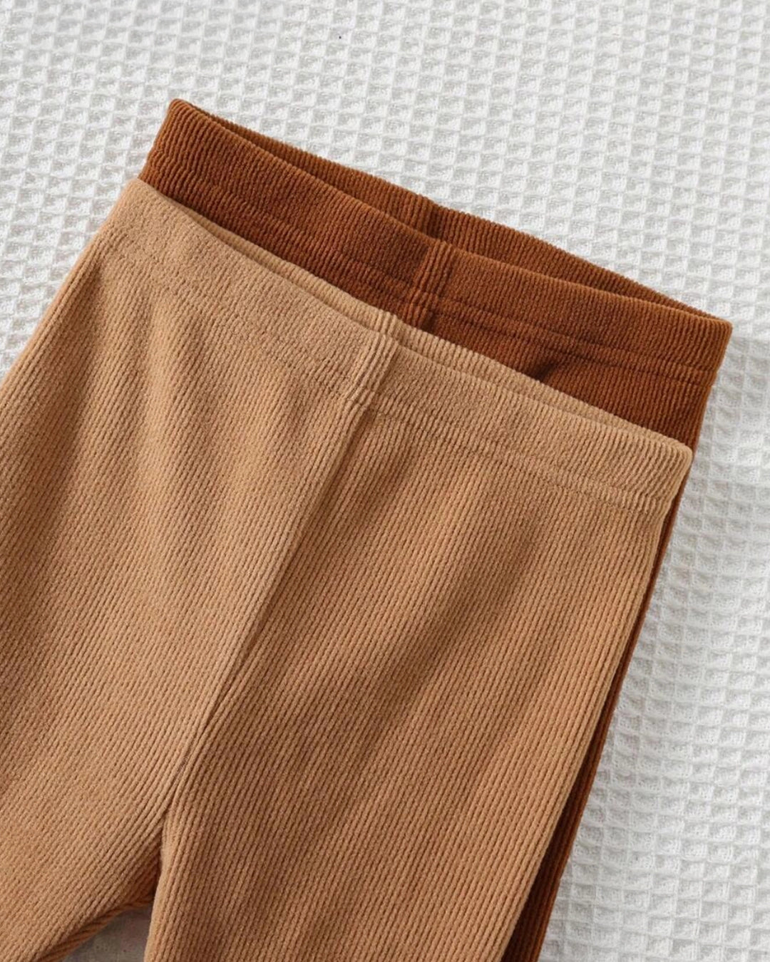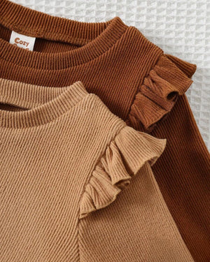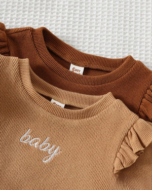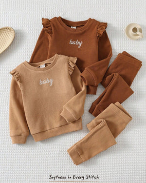 Cozy autumn/winter 2-piece set for baby girls, featuring a cute embroidered letter long sleeve top with ruffle trim and matching elastic waist pants. Perfect for casual outings, home, travel, or vacations.