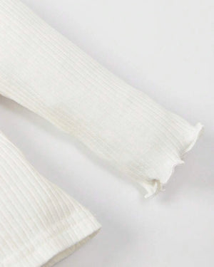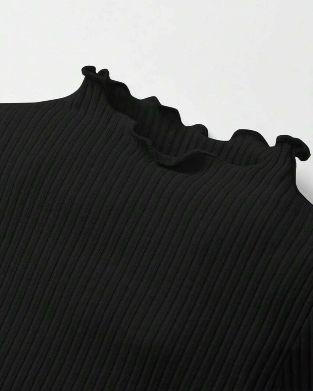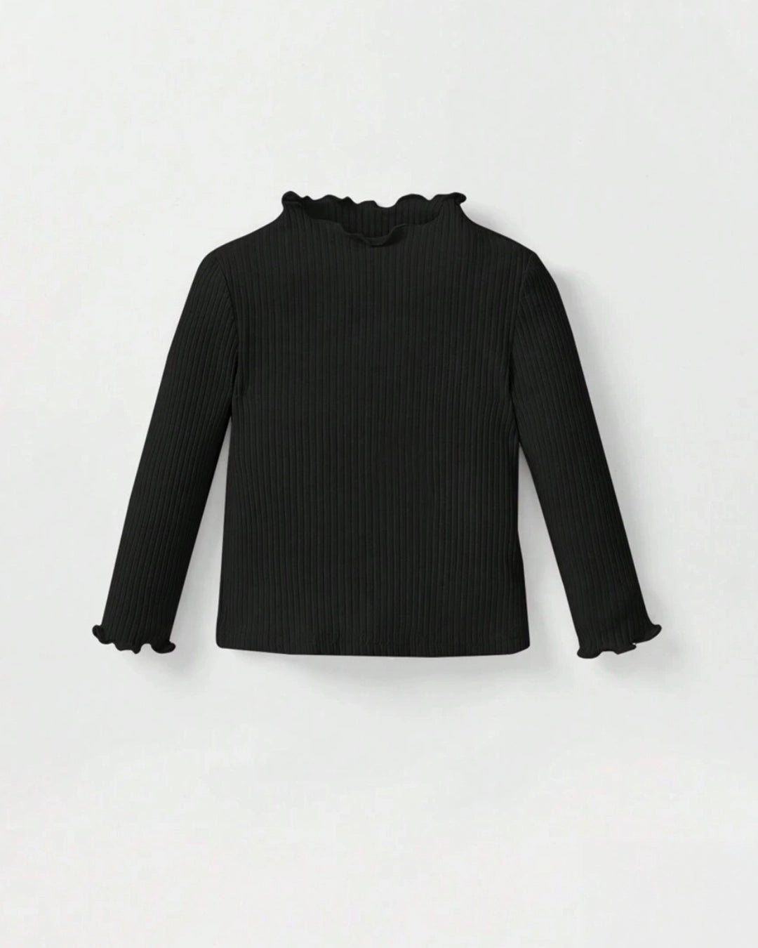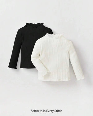 Soft and stylish long sleeve tops for baby girls, featuring a double-layer mock neck with delicate ruffled edges. Plain solid design, perfect for layering in autumn and winter. Comes in a 2-piece set for versatile everyday wear.