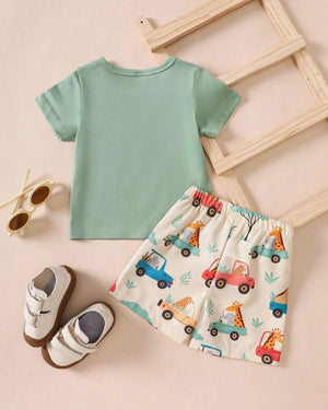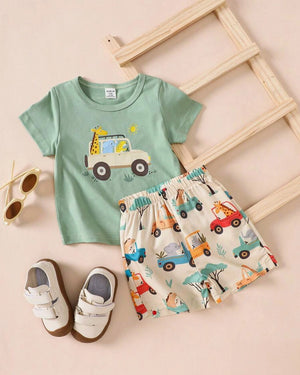 Cute cartoon-printed top and shorts set for babies, perfect for play & daily wear.