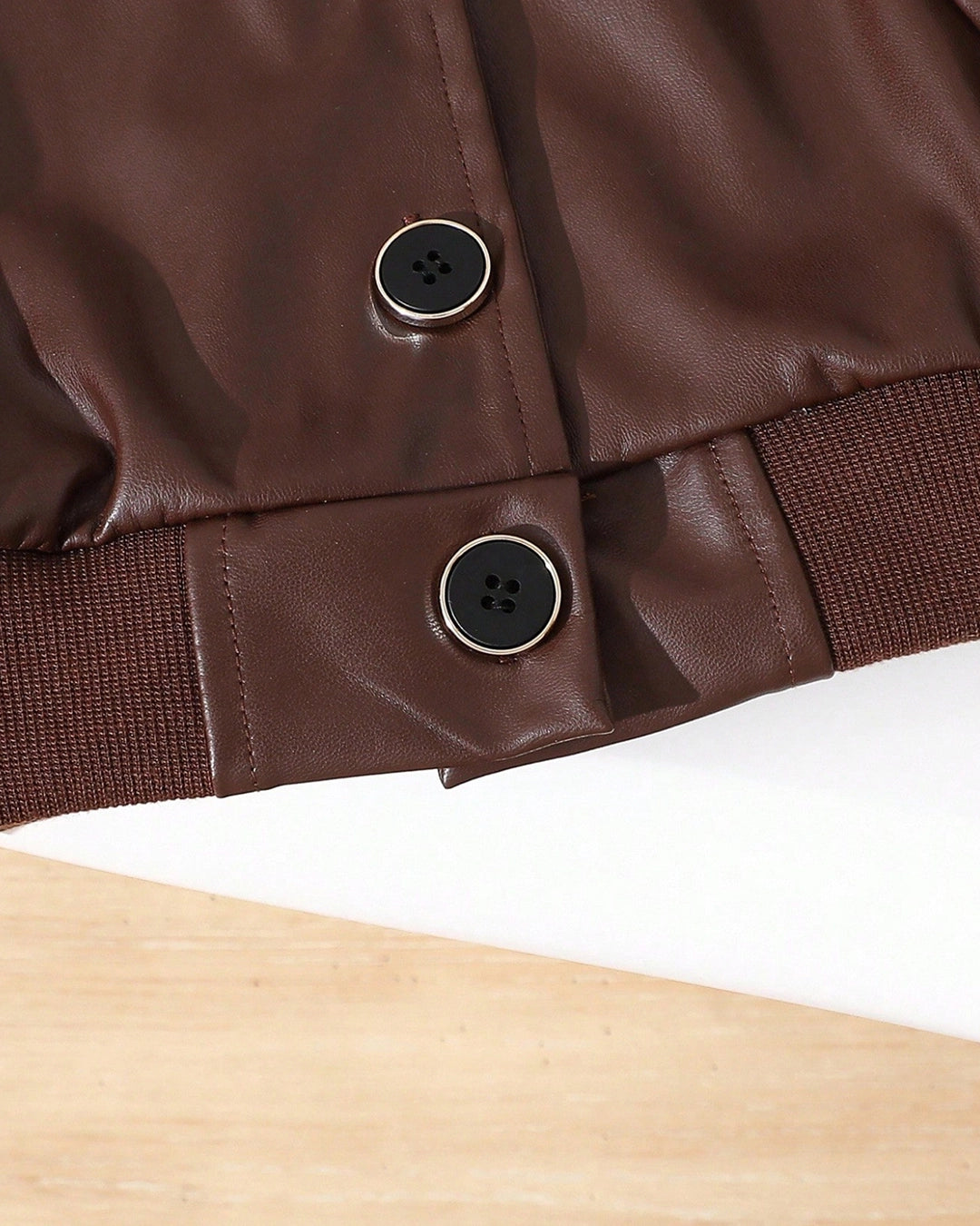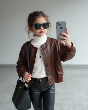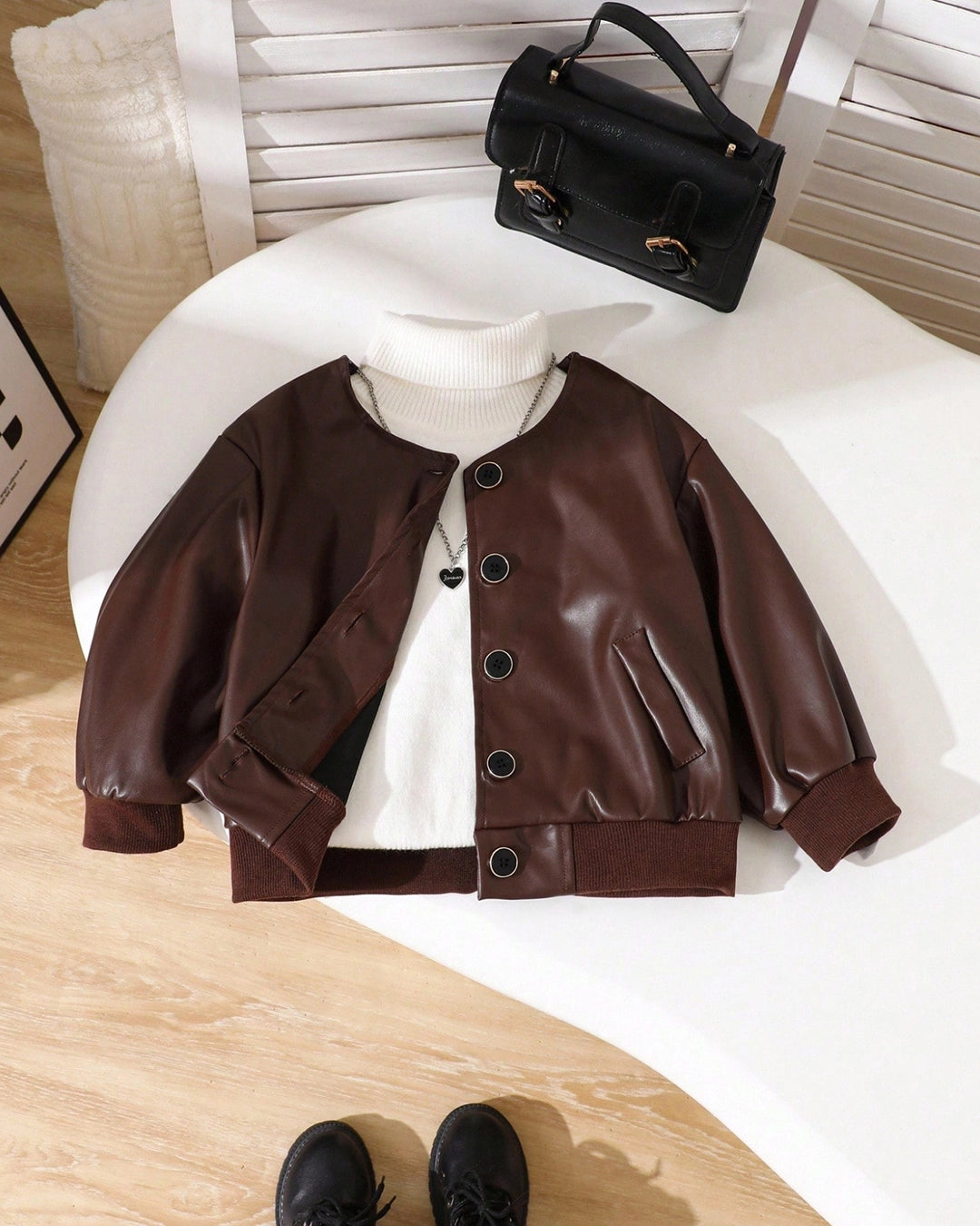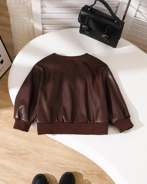 Girls Brown PU Leather Jacket – Street Style Round Neck