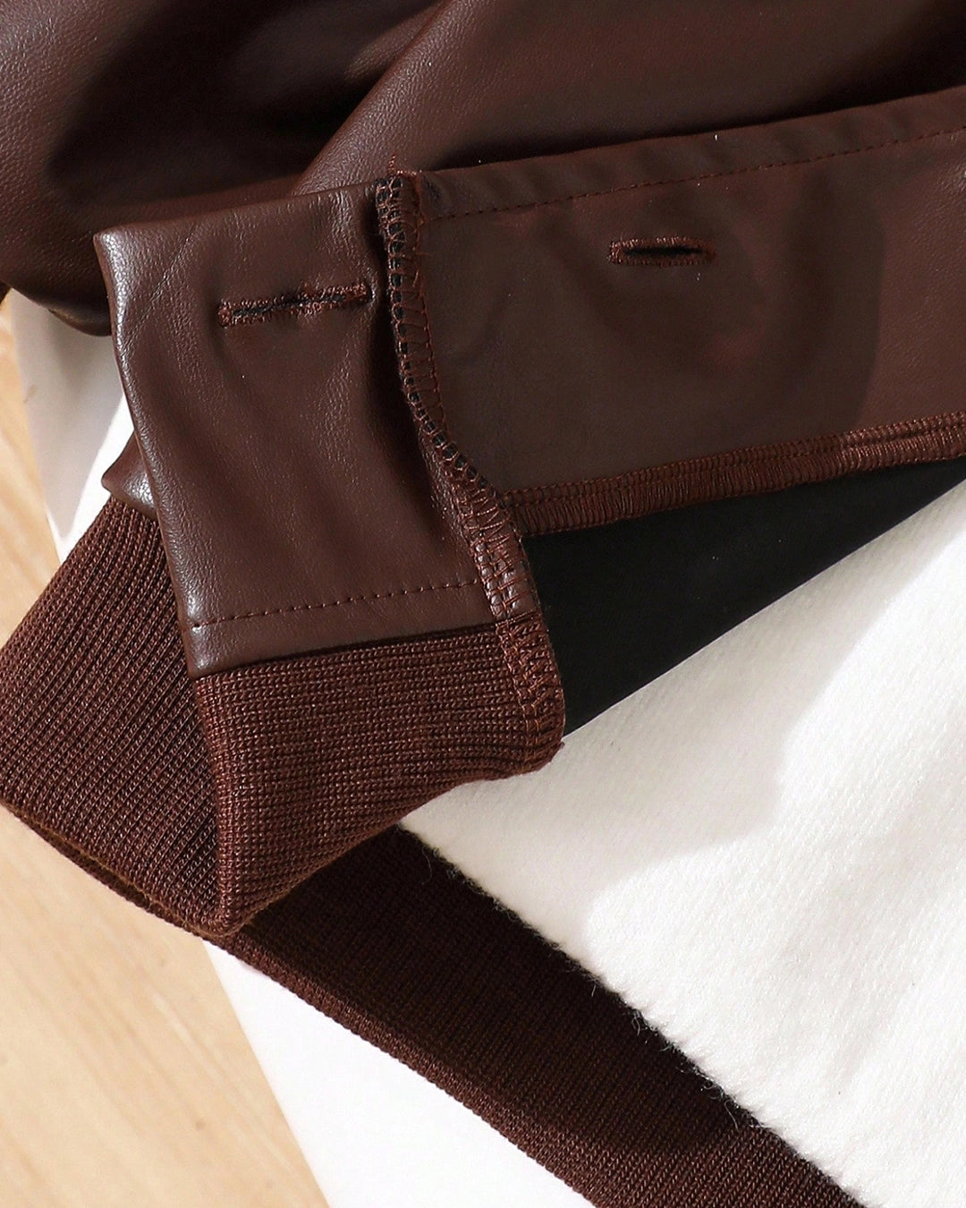 Stylish brown PU leather jacket for girls with a round neck, ribbed cuffs, and black-edged buttons. A fashionable and comfy outerwear choice for spring, autumn, and winter. Ideal for casual outings and daily looks.