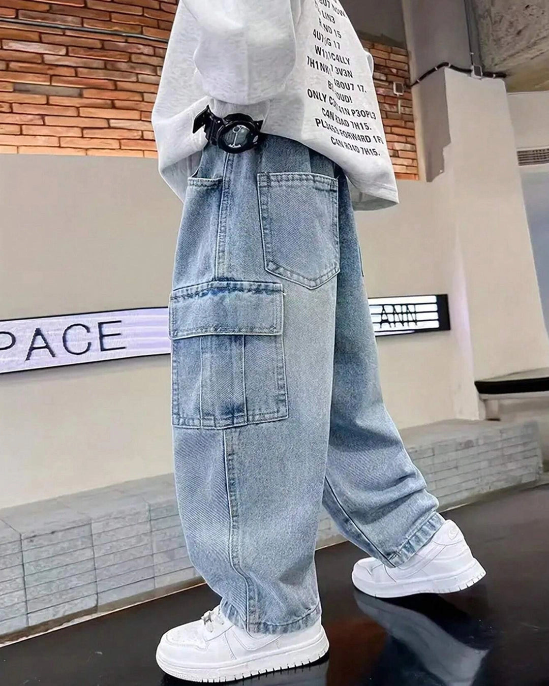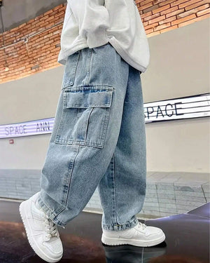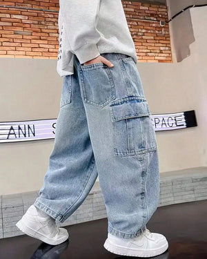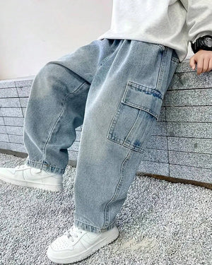 Casual straight-leg denim jeans for tween boys in a modern streetwear style. Durable, comfy, and perfect for daily outfits.