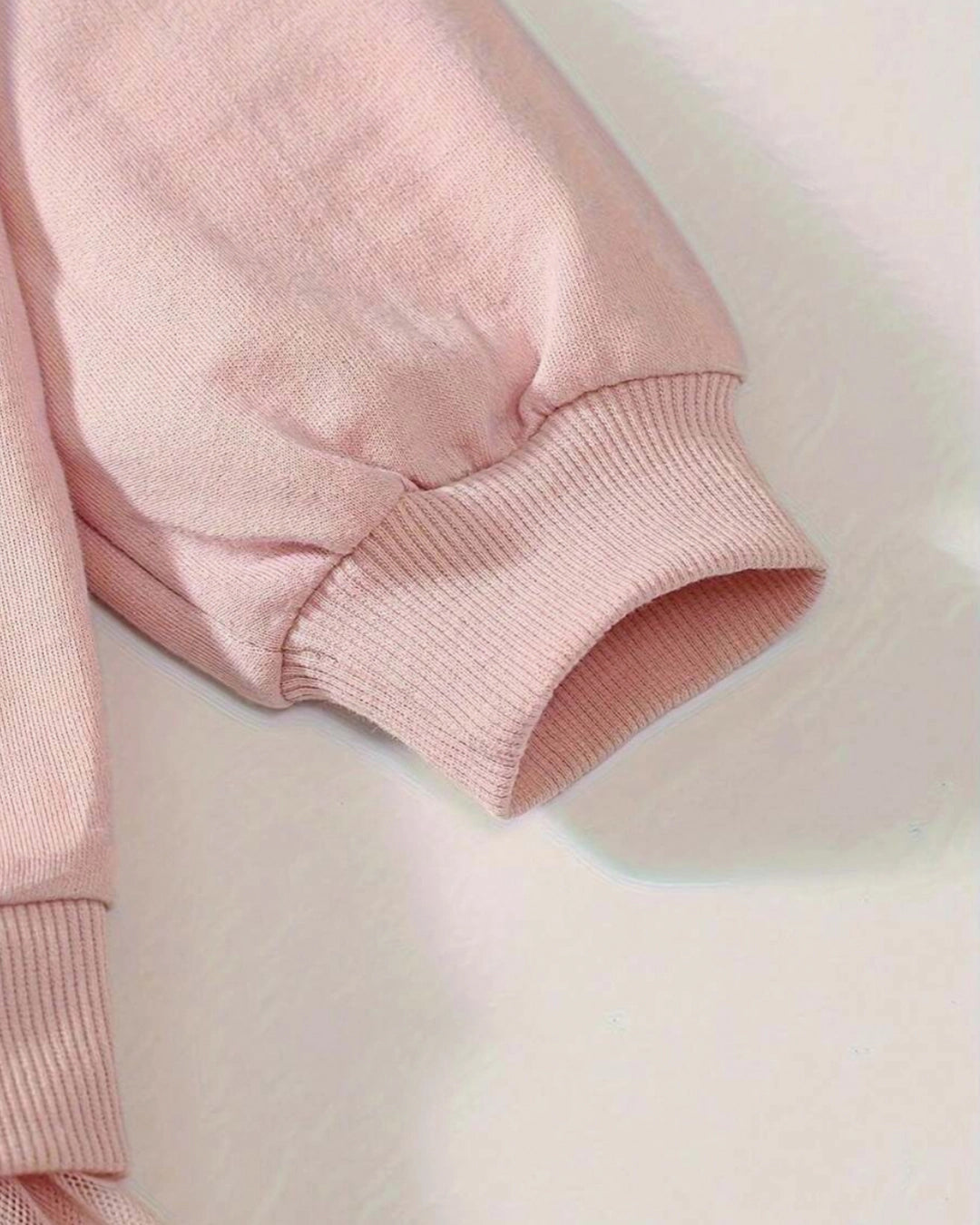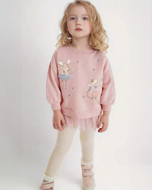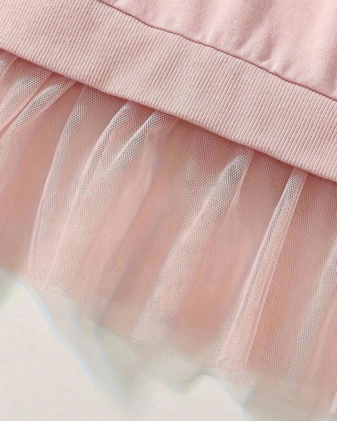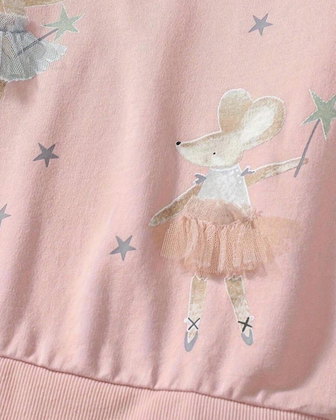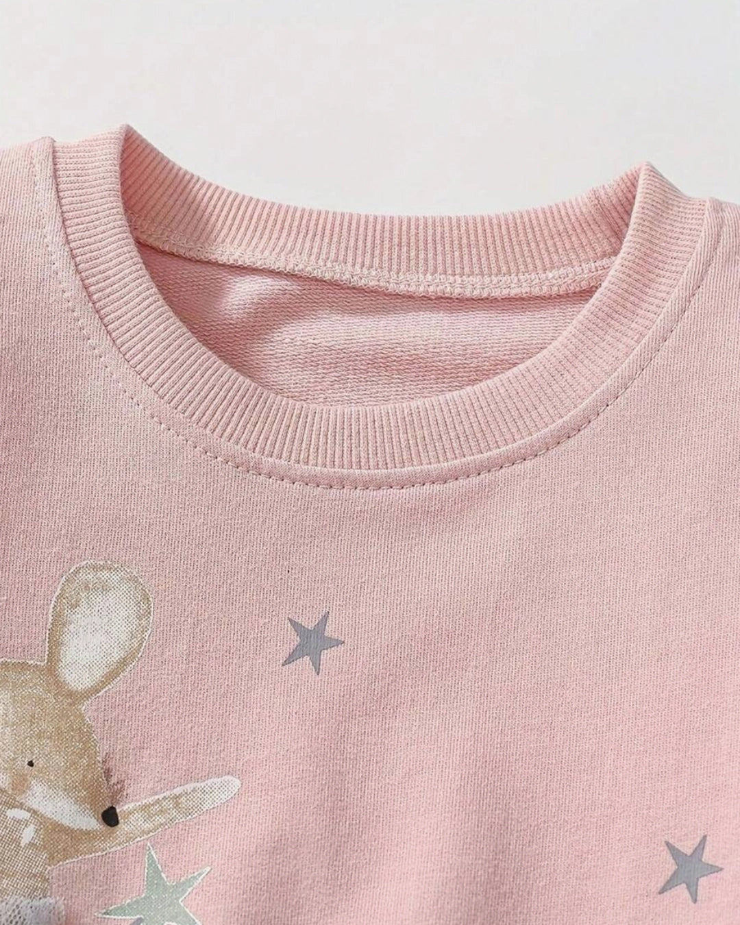 Charming autumn outfit set for young girls featuring a long sleeve top with cute cartoon prints and a stylish layered tulle skirt. Soft, breathable, and perfect for casual wear, parties, or outings. A fashionable multi-piece set combining comfort and playful design.